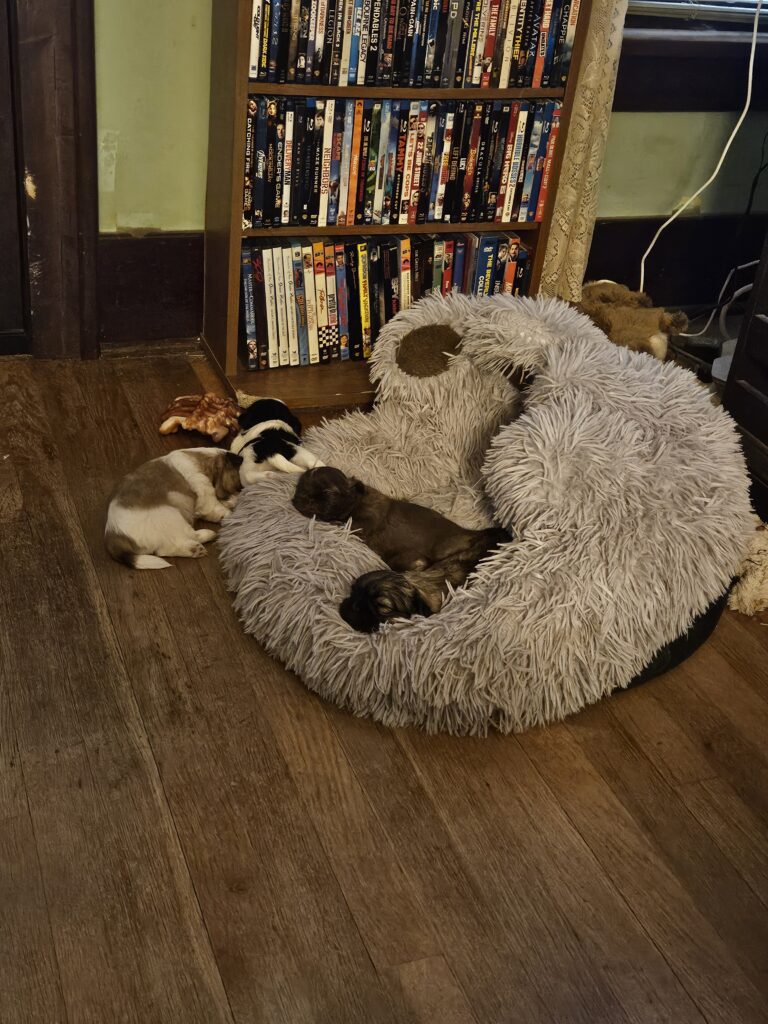 Right now I’m known to sleep with my litter mates, eat and make piddles for the hooman to clean up.