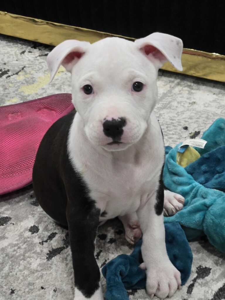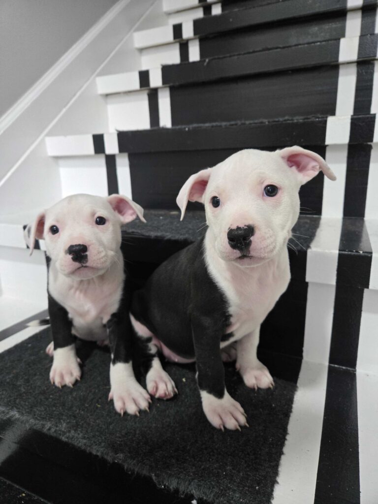 Staffordshire Terrier and Pitbull mix. We believe she is a twin from a litter of 8. (She is on the right in the photos) She is the largest from the litter. Her black and white coat is very unique and resembles her father. She has a mild temperament and always tags along with her twin sister. Videos available as well.