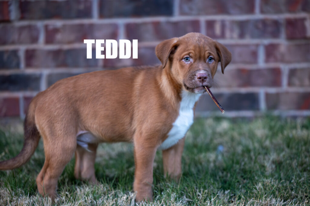 Pitbull Catahoula mix. He is 10 weeks old and from a litter of 10. He is very sweet, mild-mannered, potty pad trained, but we are currently working on getting her house trained. He has been in a kennel and does well, but isn’t fully kennel-trained yet. He and his sister Oatmeal are the only twins from the litter, and his eyes are absolutely gorgeous! I will mention that Oatmeal and Teddi are a little attached, like most twins, and I would consider a price reduction if both are purchased together and going to the same home.Â