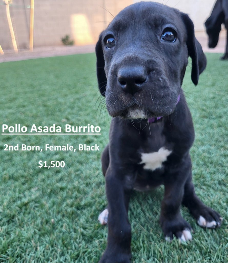 Pollo Asada is the 2nd born puppy (24oz at birth) of the litter (8 pups). She’s a big girl and loves to play with her litter mates; but she can be a bit mischievous at times. She is the first of 2 black puppies in this litter. Pups have been health checked/cleared by a Vet (Animal Medical Center of Surprise on 10/1@ 6-weeks). Pups can go to their new homes on 10/15/2025 (8 weeks). All pups come with: Lineage sheet (DNA results… Embark), shot records/sheet, Neo-Par anti-parvo vaccination (@ 4-weeks), 1st 4-in-1 shot (given on 10/1), precautionary de-worming (Panacur-C, started on 10/2), Veterinary Medical Records (AMC), and Limited Health Guarantee. There are NO ‘breeding’/spay-neuter contracts. Not only are the Mother/Dam (Voodoo-harlequin), and father/Sire (C’thuhlu-Black) on-site, but so are the Grand-Dam (Maleficent-Black) and Grand-Sire (Vlad-Black) of the father (C’thuhlu) on site as well. The sire is from Ghost-Raven Danes in Surprise, AZ., as is the dam (originally from Jessi’s Danes in Peoria, AZ.). The pups of this litter have been raised in a clean, loving, and inside environment; and are now in the first stages of using a ‘doggy door’. All pups are weaned (4 weeks), past the eating ‘gruel’ stage, and are now on dry puppy food w/DHA (which helps with mental development). More: I understand that pure-bred puppies can be expensive. As such, you have two options… 1). $500 hold deposit (non-refundable) which guarantees your pick, and then pay remaining balance at time of pick-up (10/15 or later) 2). $500 hold deposit (non-refundable) which guarantees your pick, and make payments as you like up until time of pick-up (12-weeks max). That would be (roughly) 11/15. For more pictures/info. please visit Ghost-Raven Danes Facebook page. If interested, you may contact me via the FB page as a PM, or through this site/posting to arrange visitation. There were 8 pups in the litter. There are 5 pups listed here. 3 pups have already been sold (with no adverts). They may go quick… NOTE: I am in Arizona. I do not ship puppies out of state (or at all) under any condition. The costs and liability are too high. If you are out of state and can pick the puppy up in person, that’s great. Lastly: Cash is King, but will accept Zelle payments.
