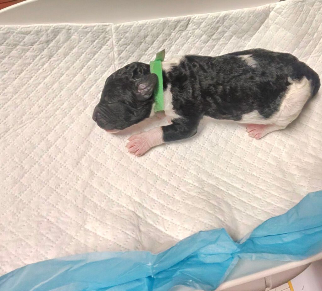 Prancer, a striking black and white Tuxedo Labradoodle. His coat is distinctly handsome and refined, and true to his name, he moves with an air of eager confidence and a playful spring in his step. His intelligent eyes are full of warmth, hinting at his keen desire to learn and bond.