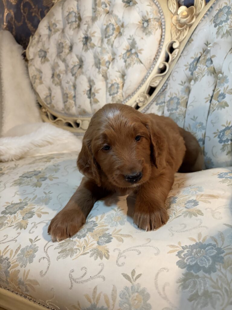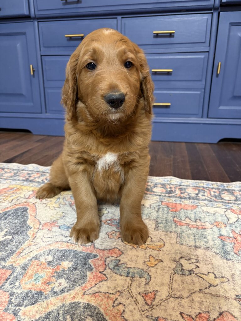 PRICE REDUCED: NOW $1500. Located in Central Indiana and can meet in Asheville, NC or surrounding area the first week of April (leading up to Easter) Snowball is an F1 small standard goldendoodle MALE puppy. He has white markings on his chest, forehead, chin, and toes. Experienced breeders with F1 golden doodle puppies available starting March 22nd. Puppies are expected to be between 45-50 lbs full grown. Pricing includes 3 rounds of deworming, 1st shot, and 2-year health warranty. Signed spay/neuter contract required. Dam: Rosie is a 45-lb AKC (red) golden retriever, born June 2022. She is very sweet and loves to play outside. She is a 4th generation golden retriever from our own line of retrievers. Sire: D’Artagnan Darty is a 43 lb AKC white parti poodle. He is a proven stud who has sired several litters of F1 golden doodles and AKC poodles. DArtagnan is cleared through Paw Prints Genetics and kbky Bb atat. Brucellosis test required for dams within 1 week of breeding. goldenpups.org