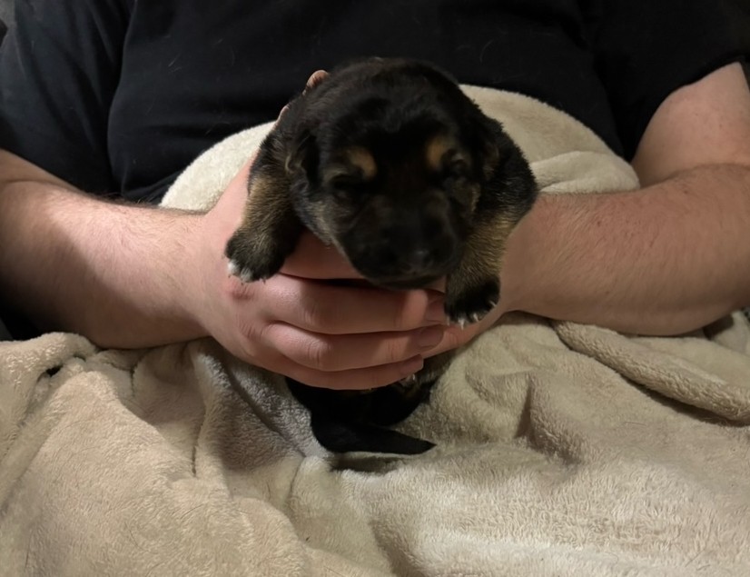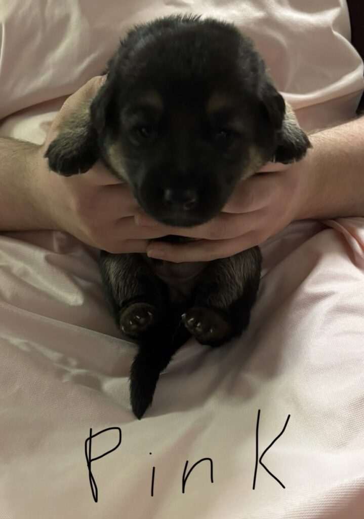 Pink Girl was our last girl born. She is mid-range size amongst the puppies. She is quiet and seems to enjoy being with her brother, Grey Boy, most of the time. I joke they’re twins. She is black & tan with a stock coat.