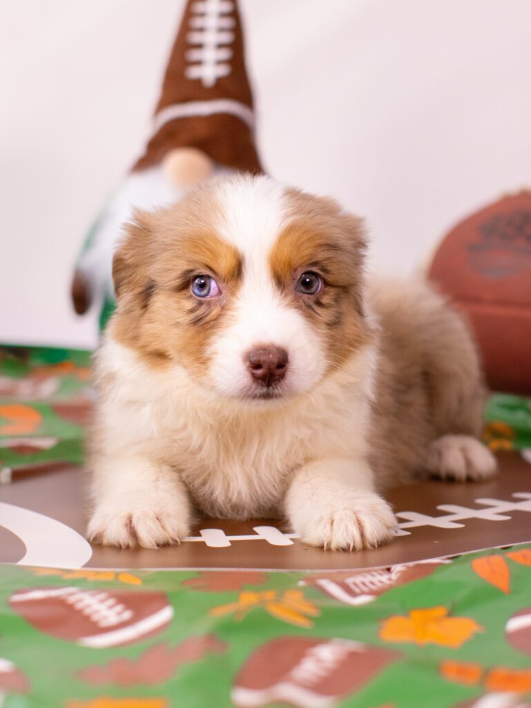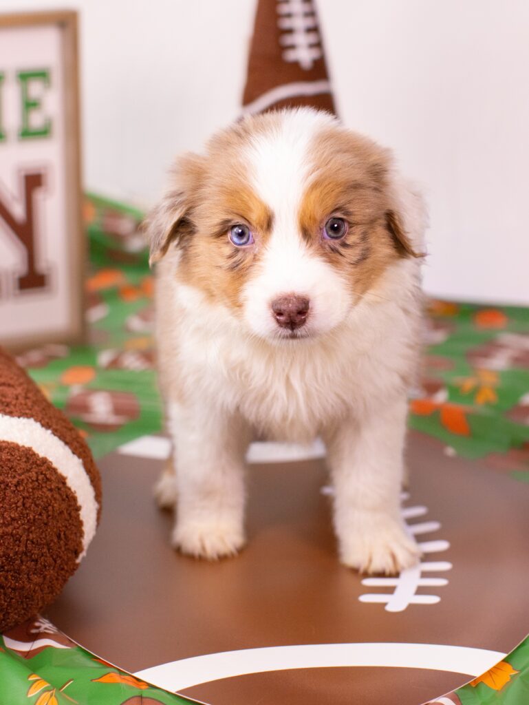 Estimated maturity size 40-50 lbs. She has rich red merle markings. She is up to date on vaccinations and deworming, has started with early socialization, and is AKC eligible.