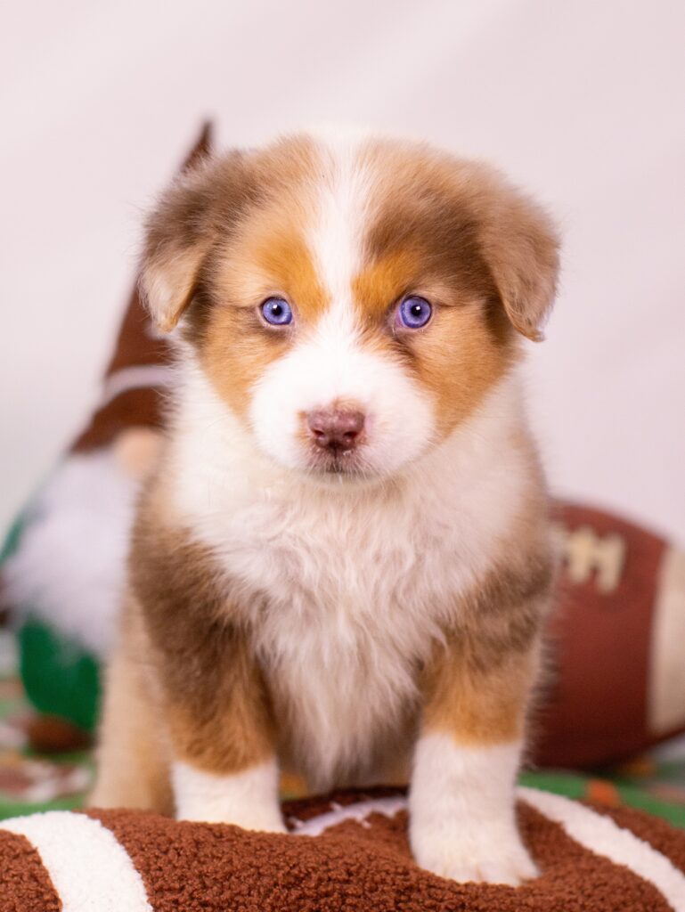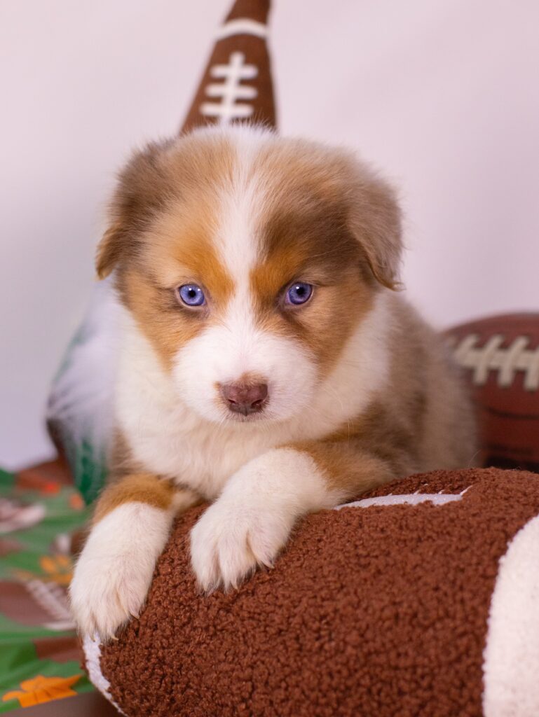 Estimated maturity size 40-50 lbs. She has beautiful red merle markings. She is up to date on vaccinations and deworming, has started with early socialization, and is AKC eligible.