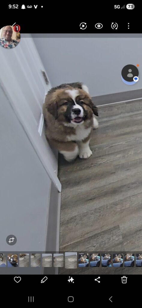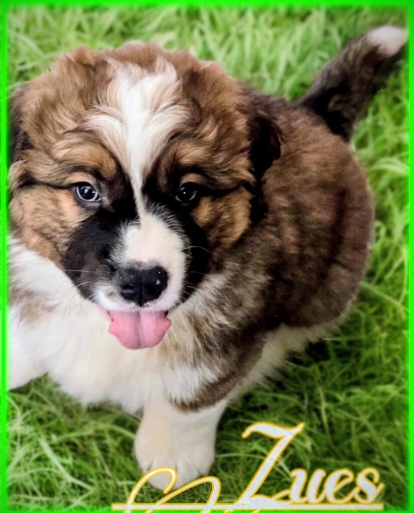 Meet Zeus, the standout star of our Saint Bernese litter! Zeus is a truly unique boy, not just for his handsome markings but for his impressive size and sweet personality.