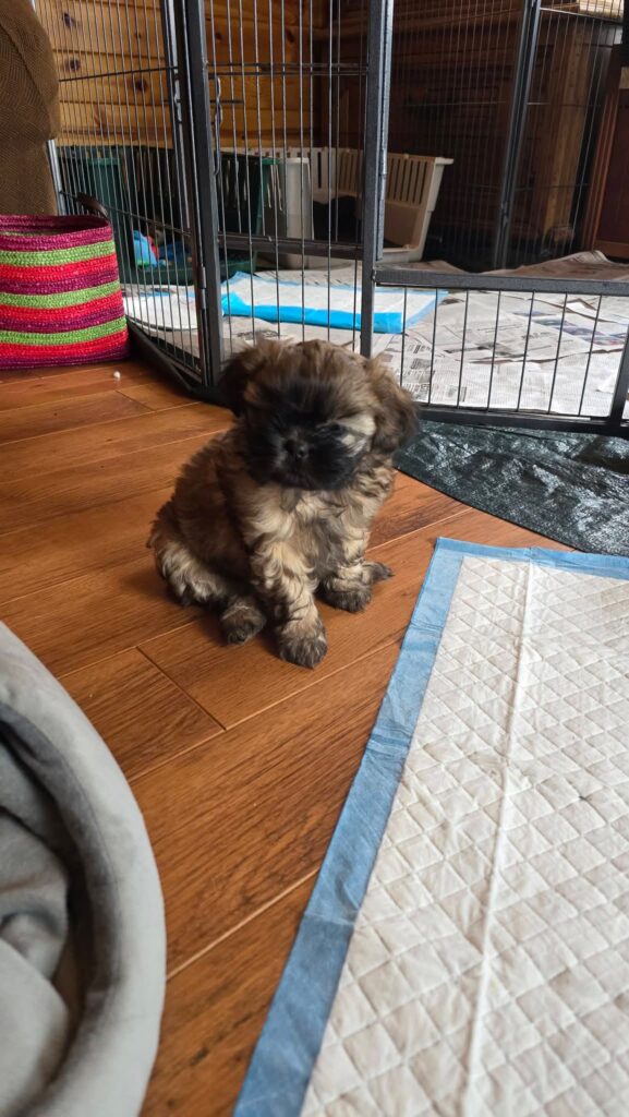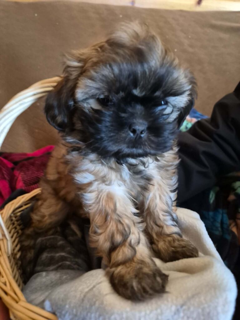 Stryder is one of three and she is full of personality. Long legs. Parents in site. She is the biggest of 3 so could get up to 15 lbs.  Wormed, vet checked and first shots. Mom is white shih tuz and yorkie and dad is shih tzu. The pups will lighten up like dad’s colors. 920-660-6792 tabatha.a.yoder@gmail.com