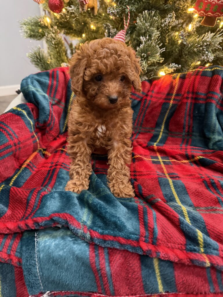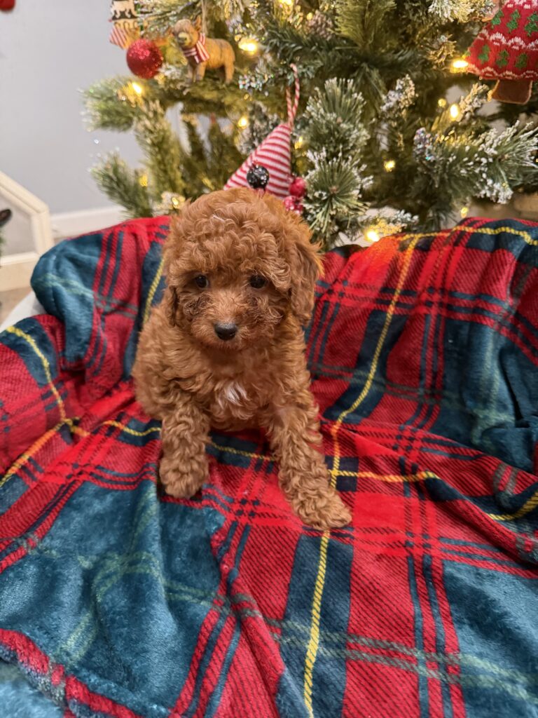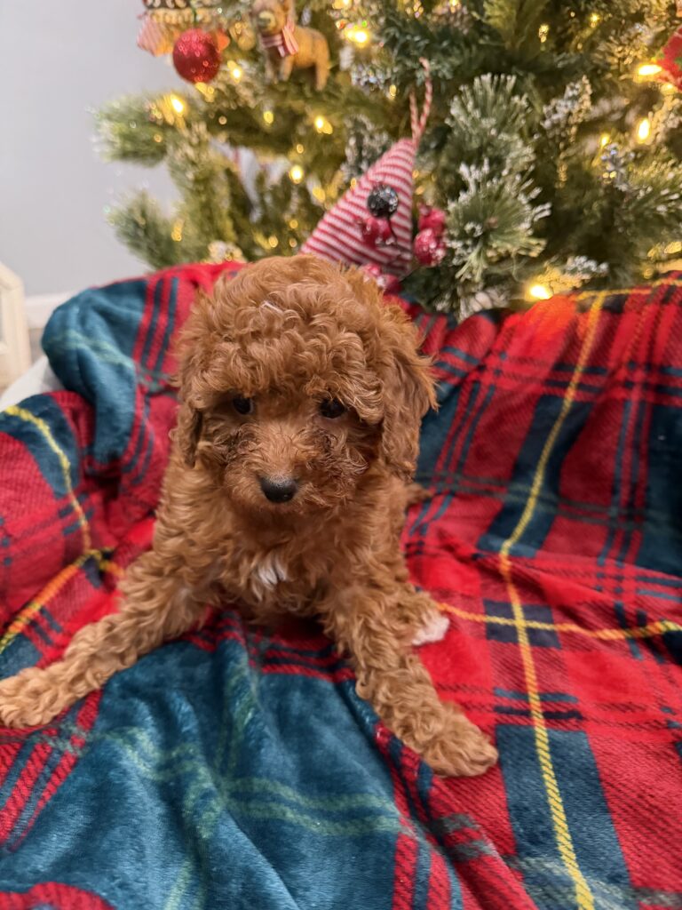 Snickerdoodle is a Cavapoo; he is copper with white patches and curly hair. He is energetic, loves cuddles, and attention. Snickerdoodle is already well on his way to being pad-trained and is familiar with basic commands, making the transition into his new home smoother. He enjoys playtime and will thrive in an environment where he receives plenty of attention and love. He would be the perfect Christmas gift for a family, and he will be a great addition to your home. We are willing to have Christmas Eve or Christmas Day Delivery or pick-ups to accommodate. He comes with his vaccination and vet records, a small bag of grain free food, and a toy that has his mom and his siblings scent on it to help him transition into his new home. We have raised our single litter (F2) Cavapoo puppies inside our home. Our puppies are raised in a loving home environment and are socialized with both children and other pets from an early age. We take pride in the care and attention we provide, ensuring that each puppy develops a friendly and well-adjusted temperament. Our puppies are dewormed, up to date on vaccinations, and vet checked. We guarantee their health. If you have any questions about Snickerdoodle or would like to arrange a visit, please feel free to contact us. We are happy to provide more photos or information upon request. Finding the right home for Vixen is very important to us, and we look forward to hearing from families who will cherish him as much as we do.