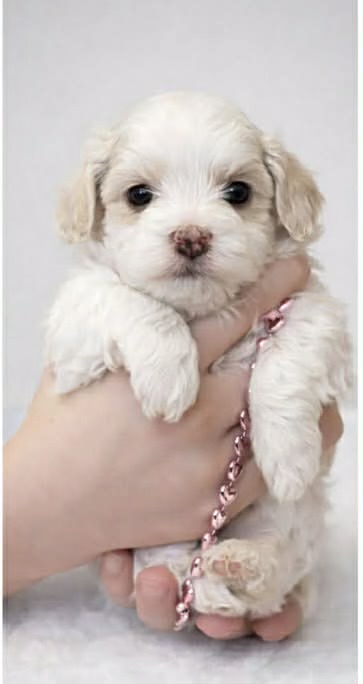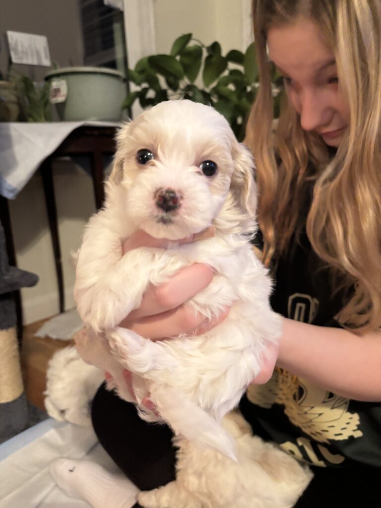 Winnie is mostly white with a tiny bit of tan spots, so cute! She is very sweet, cuddly and adorable Maltese Poochon! She is so playful and loves to be held! Her Dad is a 10 lb pure bred Maltese with CKC papers and her mom is a brown 8 lb Poochon.  Very well introduced to children and other pets, working on potty training to a potty pad, she’s doing very well with that! We can deliver puppy to you within a reasonable distance and further away with gas reimbursement/delivery fee. She will have up to date vaccines and a veterinary health exam. We love them so much and want them to go to a great and loving home.