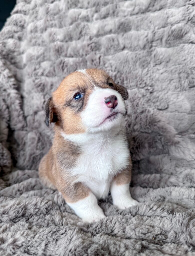 Rosie is the little heart‑melter of the litter — soft, snuggly, and absolutely convinced that every lap was made just for her. She has this gentle, soulful charm that makes you stop whatever you’re doing just to admire her. Whether she’s toddling over for cuddles or giving you that “pick me up” look, Rosie has a way of making you feel like you’re her whole world. She’s pure sweetness wrapped in corgi fluff.
