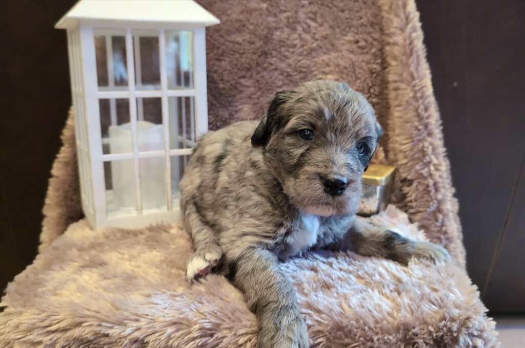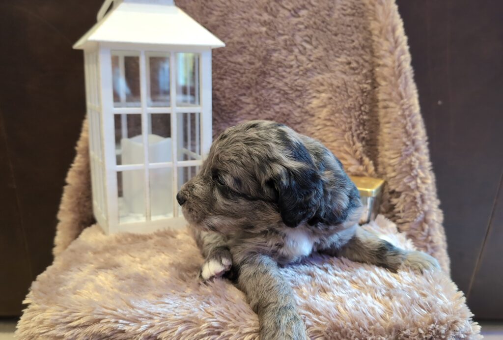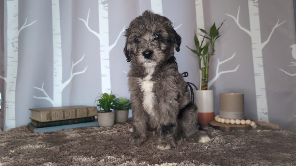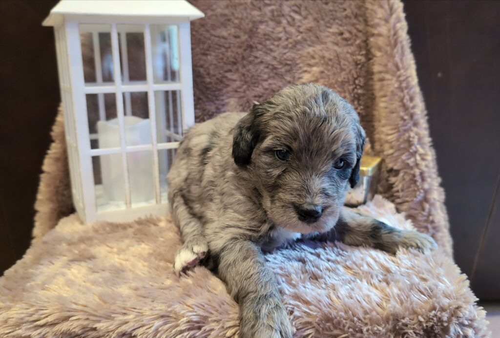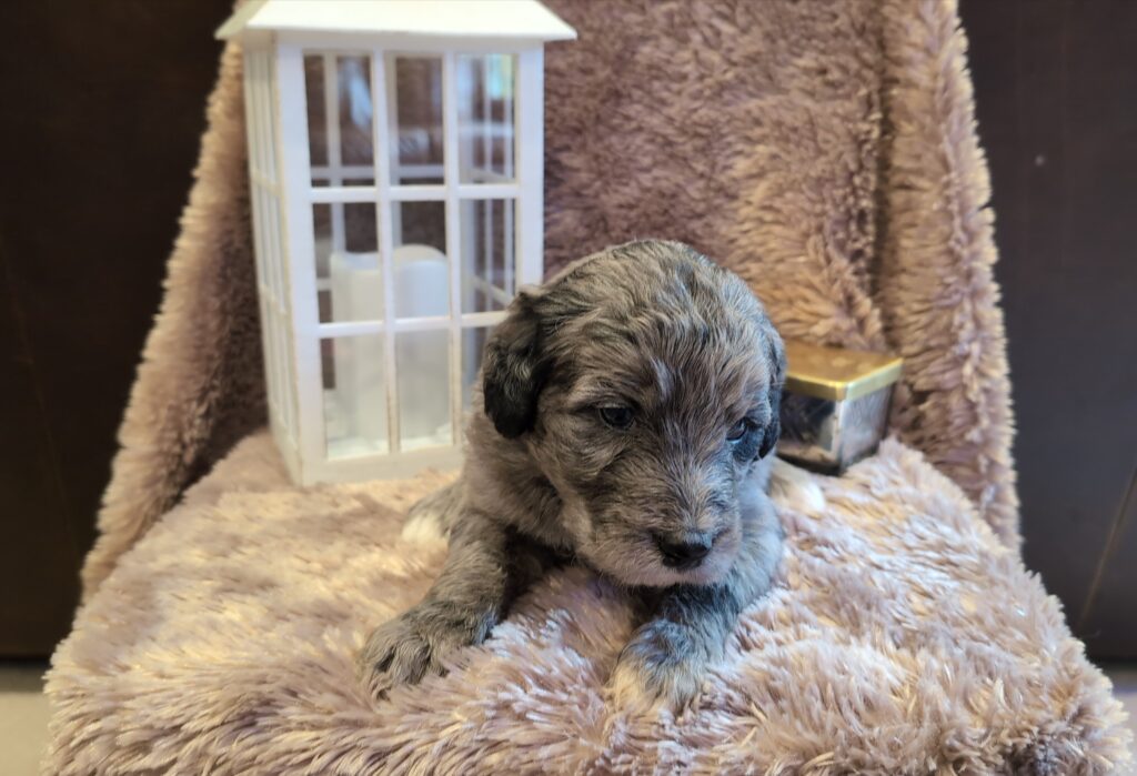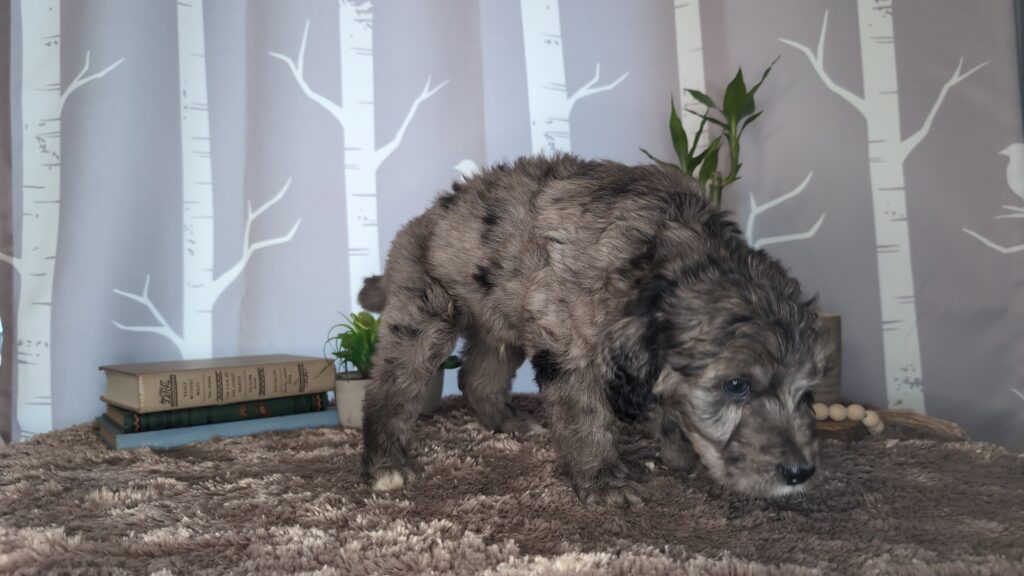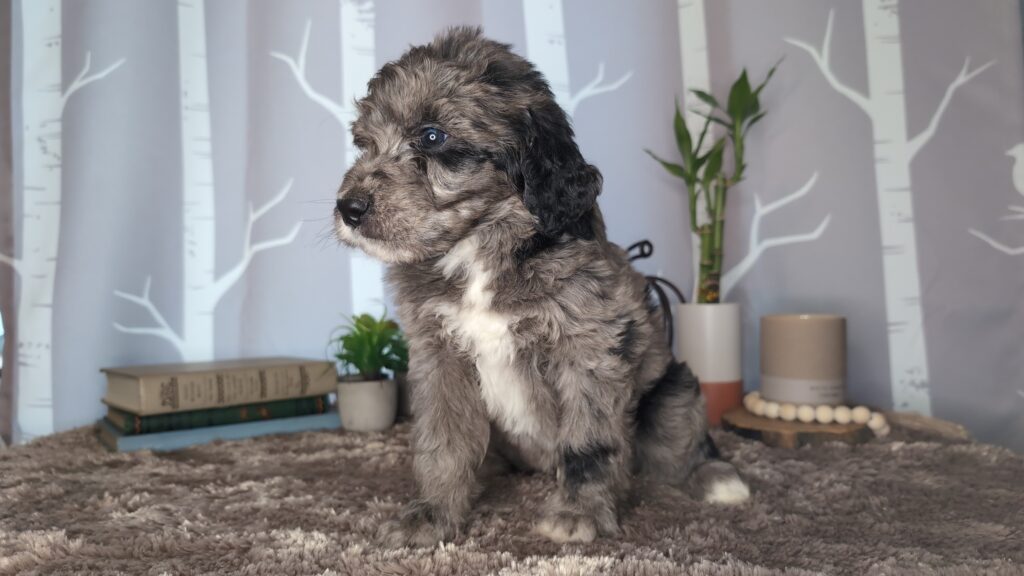 Mom is a first generation tricolor Bernedoodle (60lbs) and dad is a blue merle Standard Poodle (50lbs). Puppies are guaranteed not to shed. They are raised around children and other dogs. All puppies go home at 8 weeks with all current vaccinations, deworming, and dew claws removed. Ready to go home November 18, 2025.
