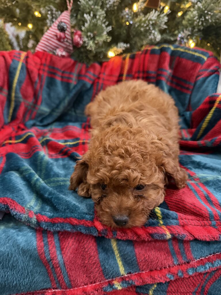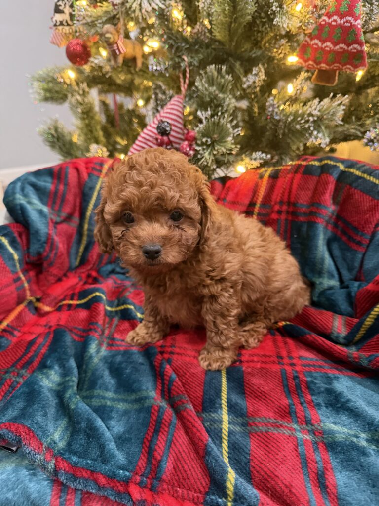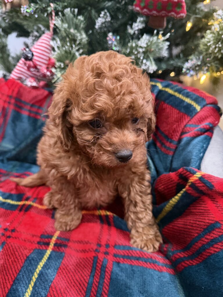 Vixen is a Cavapoo; he is copper with curly hair. He is calm, sweet, and ready for cuddles. Vixen is already well on his way to being pad-trained and is familiar with basic commands, making the transition into his new home smoother. He enjoys playtime and will thrive in an environment where he receives plenty of attention and love. He would be the perfect Christmas gift for a family, and he will be a great addition to your home. We are willing to have Christmas Eve or Christmas Day Delivery or pick-ups to accommodate. He comes with his vaccination and vet records, a small bag of grain free food, and a toy that has his mom and his siblings scent on it to help him transition into his new home. We have raised our single litter (F2) Cavapoo puppies inside our home. Our puppies are raised in a loving home environment and are socialized with both children and other pets from an early age. We take pride in the care and attention we provide, ensuring that each puppy develops a friendly and well-adjusted temperament. Our puppies are dewormed, up to date on vaccinations, and vet checked. We guarantee their health. If you have any questions about Vixen or would like to arrange a visit, please feel free to contact us. We are happy to provide more photos or information upon request. Finding the right home for Vixen is very important to us, and we look forward to hearing from families who will cherish him as much as we do.