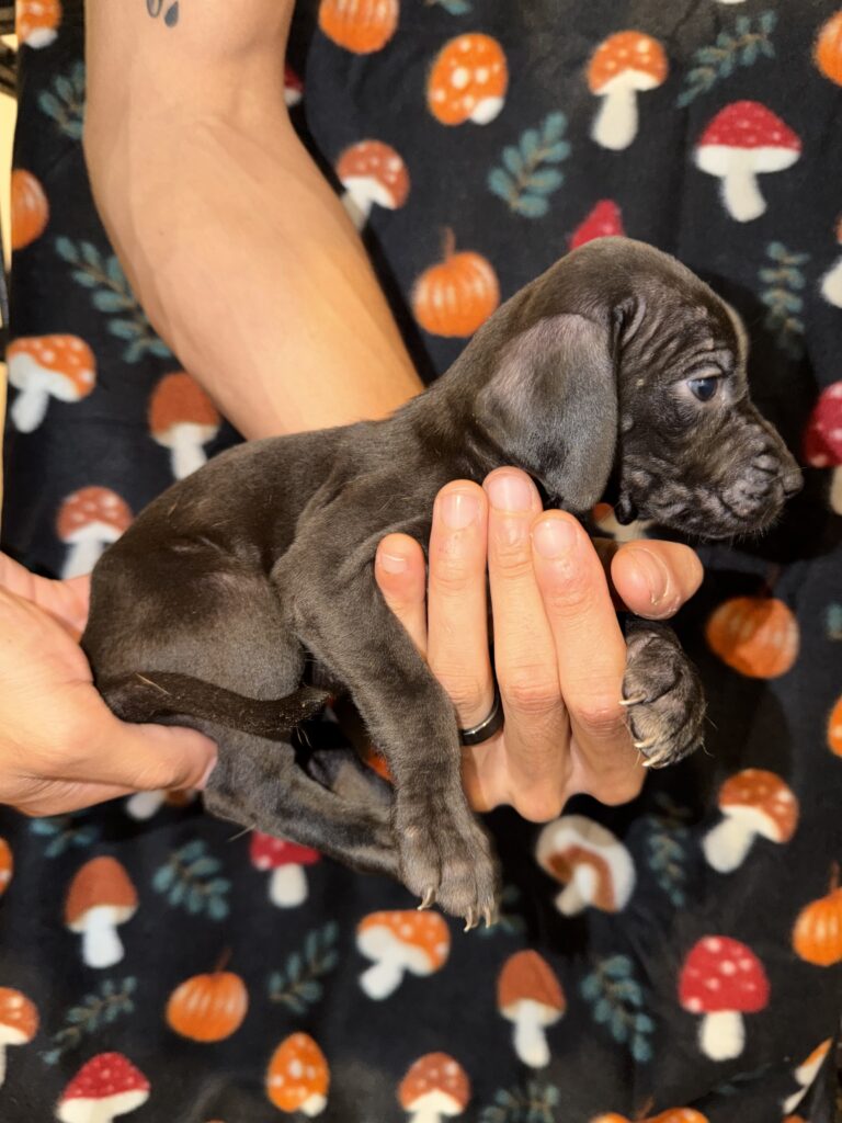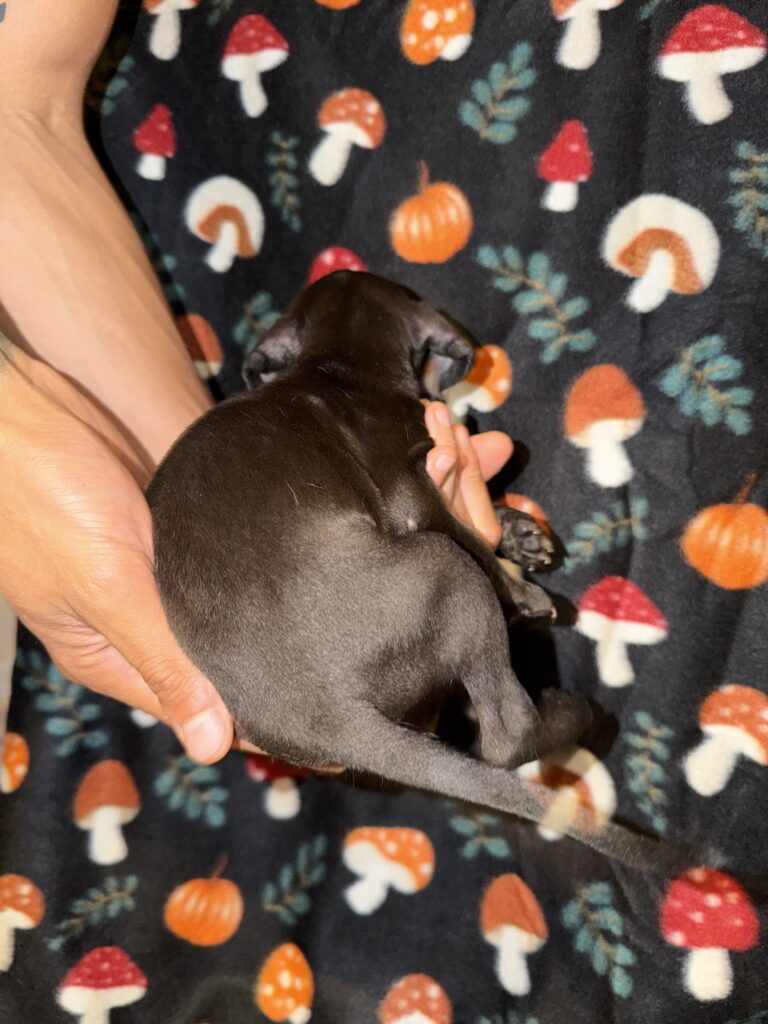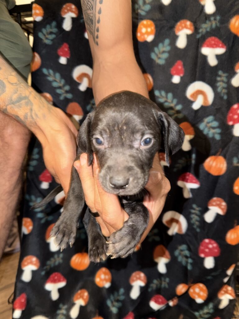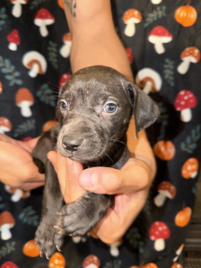 Nyx is such a sweet girl! She is black with some white on her chest and blue/amber eyes.